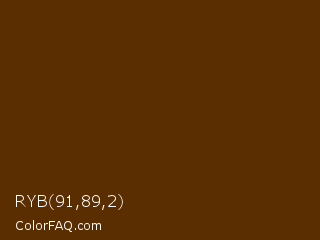 RYB 91,89,2 Color is a very dark orange color and the nearest color is Carnaby Tan #5c2e01. Hex code #5b2e02 and RGB value is rgb(91,46,2). In RGB color space, this color is composed of 36% red, 18% green, 1% blue, In CMYK color space, this color is composed of 0% cyan, 49% magenta, 98% yellow , 64% black , In HSL color space, this color has a hue angle of 30° , 96% saturation and 18% lightness.