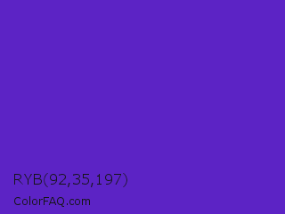 RYB 92,35,197 Color is a normal violet color and the nearest color is Purple Heart Crayola #652dc1. Hex code #5c23c5 and RGB value is rgb(92,35,197). In RGB color space, this color is composed of 36% red, 14% green, 77% blue, In CMYK color space, this color is composed of 53% cyan, 82% magenta, 0% yellow , 23% black , In HSL color space, this color has a hue angle of 261° , 70% saturation and 45% lightness.