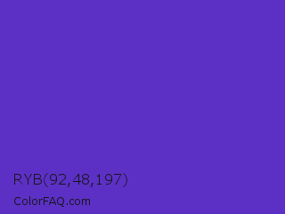 RYB 92,48,197 Color is a normal indigo color and the nearest color is Purple Heart Crayola #652dc1. Hex code #5c30c5 and RGB value is rgb(92,48,197). In RGB color space, this color is composed of 36% red, 19% green, 77% blue, In CMYK color space, this color is composed of 53% cyan, 76% magenta, 0% yellow , 23% black , In HSL color space, this color has a hue angle of 258° , 61% saturation and 48% lightness.