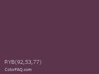 RYB 92,53,77 Color is a dark magenta color and the nearest color is Dark Byzantium #5d3954. Hex code #5c354d and RGB value is rgb(92,53,77). In RGB color space, this color is composed of 36% red, 21% green, 30% blue, In CMYK color space, this color is composed of 0% cyan, 42% magenta, 16% yellow , 64% black , In HSL color space, this color has a hue angle of 323° , 27% saturation and 28% lightness.