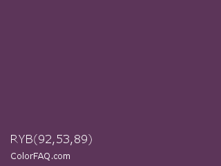 RYB 92,53,89 Color is a dark magenta color and the nearest color is Japanese Violet #5b3256. Hex code #5c3559 and RGB value is rgb(92,53,89). In RGB color space, this color is composed of 36% red, 21% green, 35% blue, In CMYK color space, this color is composed of 0% cyan, 42% magenta, 3% yellow , 64% black , In HSL color space, this color has a hue angle of 305° , 27% saturation and 28% lightness.