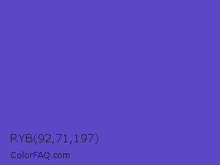 RYB 92,71,197 Color is a normal indigo color and the nearest color is Iris #5a4fcf. Hex code #5c47c5 and RGB value is rgb(92,71,197). In RGB color space, this color is composed of 36% red, 28% green, 77% blue, In CMYK color space, this color is composed of 53% cyan, 64% magenta, 0% yellow , 23% black , In HSL color space, this color has a hue angle of 250° , 52% saturation and 53% lightness.