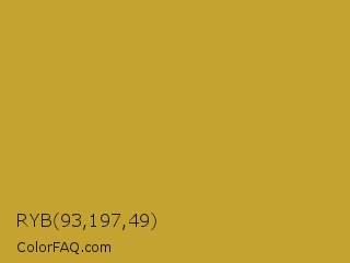 RYB 93,197,49 Color is a normal yellow color and the nearest color is Satin Sheen Gold #cba135. Hex code #c5a331 and RGB value is rgb(197,163,49). In RGB color space, this color is composed of 77% red, 64% green, 19% blue, In CMYK color space, this color is composed of 0% cyan, 17% magenta, 75% yellow , 23% black , In HSL color space, this color has a hue angle of 46° , 60% saturation and 48% lightness.