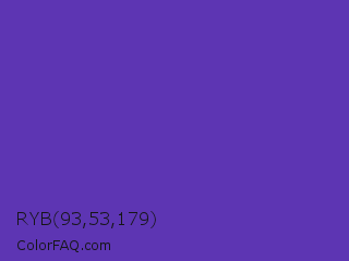 RYB 93,53,179 Color is a normal indigo color and the nearest color is Plump Purple #5946b2. Hex code #5d35b3 and RGB value is rgb(93,53,179). In RGB color space, this color is composed of 36% red, 21% green, 70% blue, In CMYK color space, this color is composed of 48% cyan, 70% magenta, 0% yellow , 30% black , In HSL color space, this color has a hue angle of 259° , 54% saturation and 45% lightness.