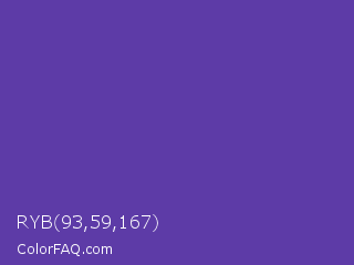 RYB 93,59,167 Color is a normal indigo color and the nearest color is Plump Purple #5946b2. Hex code #5d3ba7 and RGB value is rgb(93,59,167). In RGB color space, this color is composed of 36% red, 23% green, 65% blue, In CMYK color space, this color is composed of 44% cyan, 65% magenta, 0% yellow , 35% black , In HSL color space, this color has a hue angle of 259° , 48% saturation and 44% lightness.