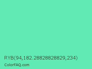 RYB 94,182.28828828829,234 Color is a light green color and the nearest color is Medium Aquamarine #66ddaa. Hex code #5eeab0 and RGB value is rgb(94,234,176). In RGB color space, this color is composed of 37% red, 92% green, 69% blue, In CMYK color space, this color is composed of 60% cyan, 0% magenta, 25% yellow , 8% black , In HSL color space, this color has a hue angle of 155° , 77% saturation and 64% lightness.