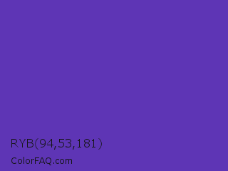 RYB 94,53,181 Color is a normal indigo color and the nearest color is Purple Heart Crayola #652dc1. Hex code #5e35b5 and RGB value is rgb(94,53,181). In RGB color space, this color is composed of 37% red, 21% green, 71% blue, In CMYK color space, this color is composed of 48% cyan, 71% magenta, 0% yellow , 29% black , In HSL color space, this color has a hue angle of 259° , 55% saturation and 46% lightness.