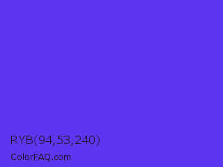 RYB 94,53,240 Color is a normal indigo color and the nearest color is Han Purple #5218fa. Hex code #5e35f0 and RGB value is rgb(94,53,240). In RGB color space, this color is composed of 37% red, 21% green, 94% blue, In CMYK color space, this color is composed of 61% cyan, 78% magenta, 0% yellow , 6% black , In HSL color space, this color has a hue angle of 253° , 86% saturation and 57% lightness.