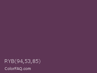 RYB 94,53,85 Color is a dark magenta color and the nearest color is Dark Byzantium #5d3954. Hex code #5e3555 and RGB value is rgb(94,53,85). In RGB color space, this color is composed of 37% red, 21% green, 33% blue, In CMYK color space, this color is composed of 0% cyan, 44% magenta, 10% yellow , 63% black , In HSL color space, this color has a hue angle of 313° , 28% saturation and 29% lightness.