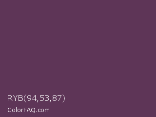RYB 94,53,87 Color is a dark magenta color and the nearest color is Japanese Violet #5b3256. Hex code #5e3557 and RGB value is rgb(94,53,87). In RGB color space, this color is composed of 37% red, 21% green, 34% blue, In CMYK color space, this color is composed of 0% cyan, 44% magenta, 7% yellow , 63% black , In HSL color space, this color has a hue angle of 310° , 28% saturation and 29% lightness.