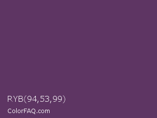 RYB 94,53,99 Color is a dark magenta color and the nearest color is Imperial #602f6b. Hex code #5e3563 and RGB value is rgb(94,53,99). In RGB color space, this color is composed of 37% red, 21% green, 39% blue, In CMYK color space, this color is composed of 5% cyan, 46% magenta, 0% yellow , 61% black , In HSL color space, this color has a hue angle of 293° , 30% saturation and 30% lightness.