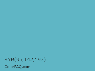 RYB 95,142,197 Color is a normal cyan color and the nearest color is Fountain Blue #56b4be. Hex code #5fb6c5 and RGB value is rgb(95,182,197). In RGB color space, this color is composed of 37% red, 71% green, 77% blue, In CMYK color space, this color is composed of 52% cyan, 8% magenta, 0% yellow , 23% black , In HSL color space, this color has a hue angle of 189° , 47% saturation and 57% lightness.