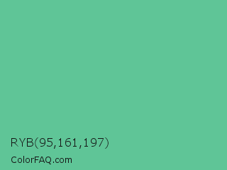 RYB 95,161,197 Color is a normal green color and the nearest color is Silver Tree #66b58f. Hex code #5fc597 and RGB value is rgb(95,197,151). In RGB color space, this color is composed of 37% red, 77% green, 59% blue, In CMYK color space, this color is composed of 52% cyan, 0% magenta, 23% yellow , 23% black , In HSL color space, this color has a hue angle of 153° , 47% saturation and 57% lightness.