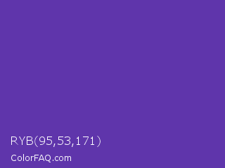 RYB 95,53,171 Color is a normal violet color and the nearest color is Purple Heart #69359c. Hex code #5f35ab and RGB value is rgb(95,53,171). In RGB color space, this color is composed of 37% red, 21% green, 67% blue, In CMYK color space, this color is composed of 44% cyan, 69% magenta, 0% yellow , 33% black , In HSL color space, this color has a hue angle of 261° , 53% saturation and 44% lightness.