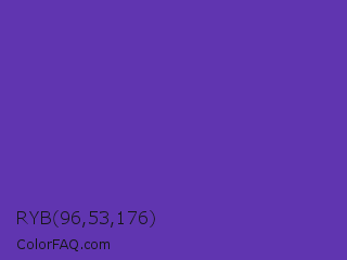 RYB 96,53,176 Color is a normal violet color and the nearest color is Plump Purple #5946b2. Hex code #6035b0 and RGB value is rgb(96,53,176). In RGB color space, this color is composed of 38% red, 21% green, 69% blue, In CMYK color space, this color is composed of 45% cyan, 70% magenta, 0% yellow , 31% black , In HSL color space, this color has a hue angle of 261° , 54% saturation and 45% lightness.