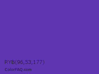 RYB 96,53,177 Color is a normal violet color and the nearest color is Plump Purple #5946b2. Hex code #6035b1 and RGB value is rgb(96,53,177). In RGB color space, this color is composed of 38% red, 21% green, 69% blue, In CMYK color space, this color is composed of 46% cyan, 70% magenta, 0% yellow , 31% black , In HSL color space, this color has a hue angle of 261° , 54% saturation and 45% lightness.