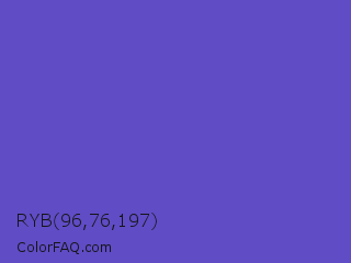 RYB 96,76,197 Color is a normal indigo color and the nearest color is Iris #5a4fcf. Hex code #604cc5 and RGB value is rgb(96,76,197). In RGB color space, this color is composed of 38% red, 30% green, 77% blue, In CMYK color space, this color is composed of 51% cyan, 61% magenta, 0% yellow , 23% black , In HSL color space, this color has a hue angle of 250° , 51% saturation and 54% lightness.