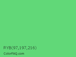 RYB 97,197,216 Color is a light green color and the nearest color is Very Light Malachite Green #64e986. Hex code #61d878 and RGB value is rgb(97,216,120). In RGB color space, this color is composed of 38% red, 85% green, 47% blue, In CMYK color space, this color is composed of 55% cyan, 0% magenta, 44% yellow , 15% black , In HSL color space, this color has a hue angle of 132° , 60% saturation and 61% lightness.