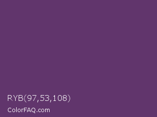 RYB 97,53,108 Color is a normal purple color and the nearest color is Imperial #602f6b. Hex code #61356c and RGB value is rgb(97,53,108). In RGB color space, this color is composed of 38% red, 21% green, 42% blue, In CMYK color space, this color is composed of 10% cyan, 51% magenta, 0% yellow , 58% black , In HSL color space, this color has a hue angle of 288° , 34% saturation and 32% lightness.