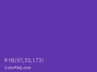 RYB 97,53,173 Color is a normal violet color and the nearest color is Grape #6f2da8. Hex code #6135ad and RGB value is rgb(97,53,173). In RGB color space, this color is composed of 38% red, 21% green, 68% blue, In CMYK color space, this color is composed of 44% cyan, 69% magenta, 0% yellow , 32% black , In HSL color space, this color has a hue angle of 262° , 53% saturation and 44% lightness.