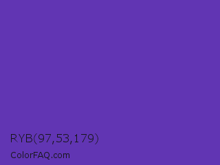 RYB 97,53,179 Color is a normal violet color and the nearest color is Purple Heart Crayola #652dc1. Hex code #6135b3 and RGB value is rgb(97,53,179). In RGB color space, this color is composed of 38% red, 21% green, 70% blue, In CMYK color space, this color is composed of 46% cyan, 70% magenta, 0% yellow , 30% black , In HSL color space, this color has a hue angle of 261° , 54% saturation and 45% lightness.