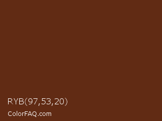 RYB 97,53,20 Color is a dark orange color and the nearest color is Espresso #612718. Hex code #612b14 and RGB value is rgb(97,43,20). In RGB color space, this color is composed of 38% red, 17% green, 8% blue, In CMYK color space, this color is composed of 0% cyan, 56% magenta, 79% yellow , 62% black , In HSL color space, this color has a hue angle of 18° , 66% saturation and 23% lightness.