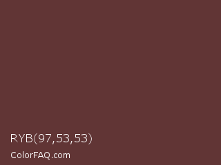 RYB 97,53,53 Color is a dark red color and the nearest color is Buccaneer #622f30. Hex code #613535 and RGB value is rgb(97,53,53). In RGB color space, this color is composed of 38% red, 21% green, 21% blue, In CMYK color space, this color is composed of 0% cyan, 45% magenta, 45% yellow , 62% black , In HSL color space, this color has a hue angle of 0° , 29% saturation and 29% lightness.