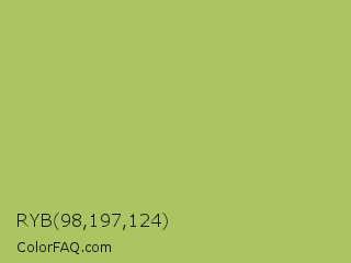 RYB 98,197,124 Color is a normal lime color and the nearest color is Middle Green Yellow #acbf60. Hex code #abc562 and RGB value is rgb(171,197,98). In RGB color space, this color is composed of 67% red, 77% green, 38% blue, In CMYK color space, this color is composed of 13% cyan, 0% magenta, 50% yellow , 23% black , In HSL color space, this color has a hue angle of 76° , 46% saturation and 58% lightness.