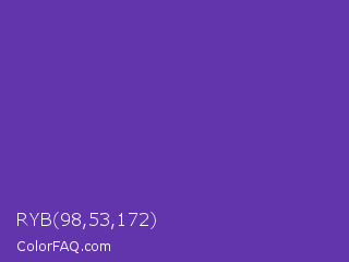 RYB 98,53,172 Color is a normal violet color and the nearest color is Grape #6f2da8. Hex code #6235ac and RGB value is rgb(98,53,172). In RGB color space, this color is composed of 38% red, 21% green, 67% blue, In CMYK color space, this color is composed of 43% cyan, 69% magenta, 0% yellow , 33% black , In HSL color space, this color has a hue angle of 263° , 53% saturation and 44% lightness.