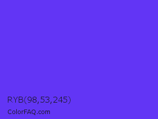 RYB 98,53,245 Color is a normal indigo color and the nearest color is Han Purple #5218fa. Hex code #6235f5 and RGB value is rgb(98,53,245). In RGB color space, this color is composed of 38% red, 21% green, 96% blue, In CMYK color space, this color is composed of 60% cyan, 78% magenta, 0% yellow , 4% black , In HSL color space, this color has a hue angle of 254° , 91% saturation and 58% lightness.