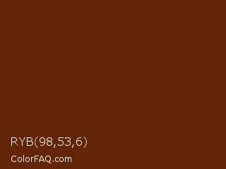 RYB 98,53,6 Color is a very dark orange color and the nearest color is Brown Bramble #592804. Hex code #622506 and RGB value is rgb(98,37,6). In RGB color space, this color is composed of 38% red, 15% green, 2% blue, In CMYK color space, this color is composed of 0% cyan, 62% magenta, 94% yellow , 62% black , In HSL color space, this color has a hue angle of 20° , 88% saturation and 20% lightness.