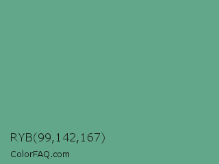RYB 99,142,167 Color is a normal green color and the nearest color is Polished Pine #5da493. Hex code #63a78b and RGB value is rgb(99,167,139). In RGB color space, this color is composed of 39% red, 65% green, 55% blue, In CMYK color space, this color is composed of 41% cyan, 0% magenta, 17% yellow , 35% black , In HSL color space, this color has a hue angle of 155° , 28% saturation and 52% lightness.