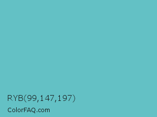 RYB 99,147,197 Color is a normal cyan color and the nearest color is Downy #6fd0c5. Hex code #63c1c5 and RGB value is rgb(99,193,197). In RGB color space, this color is composed of 39% red, 76% green, 77% blue, In CMYK color space, this color is composed of 50% cyan, 2% magenta, 0% yellow , 23% black , In HSL color space, this color has a hue angle of 182° , 46% saturation and 58% lightness.