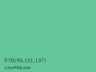 RYB 99,161,197 Color is a normal green color and the nearest color is Silver Tree #66b58f. Hex code #63c59c and RGB value is rgb(99,197,156). In RGB color space, this color is composed of 39% red, 77% green, 61% blue, In CMYK color space, this color is composed of 50% cyan, 0% magenta, 21% yellow , 23% black , In HSL color space, this color has a hue angle of 155° , 46% saturation and 58% lightness.