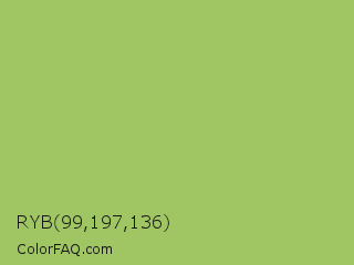 RYB 99,197,136 Color is a normal green color and the nearest color is Middle Green Yellow #acbf60. Hex code #a0c563 and RGB value is rgb(160,197,99). In RGB color space, this color is composed of 63% red, 77% green, 39% blue, In CMYK color space, this color is composed of 19% cyan, 0% magenta, 50% yellow , 23% black , In HSL color space, this color has a hue angle of 83° , 46% saturation and 58% lightness.