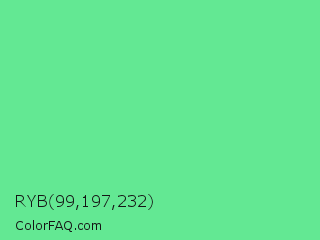 RYB 99,197,232 Color is a light green color and the nearest color is Very Light Malachite Green #64e986. Hex code #63e893 and RGB value is rgb(99,232,147). In RGB color space, this color is composed of 39% red, 91% green, 58% blue, In CMYK color space, this color is composed of 57% cyan, 0% magenta, 37% yellow , 9% black , In HSL color space, this color has a hue angle of 142° , 74% saturation and 65% lightness.