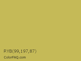 RYB 99,197,87 Color is a normal yellow color and the nearest color is Vegas Gold #c5b358. Hex code #c5ba57 and RGB value is rgb(197,186,87). In RGB color space, this color is composed of 77% red, 73% green, 34% blue, In CMYK color space, this color is composed of 0% cyan, 6% magenta, 56% yellow , 23% black , In HSL color space, this color has a hue angle of 54° , 49% saturation and 56% lightness.