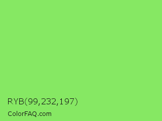 RYB 99,232,197 Color is a light green color and the nearest color is Pastel Green #77dd77. Hex code #86e863 and RGB value is rgb(134,232,99). In RGB color space, this color is composed of 53% red, 91% green, 39% blue, In CMYK color space, this color is composed of 42% cyan, 0% magenta, 57% yellow , 9% black , In HSL color space, this color has a hue angle of 104° , 74% saturation and 65% lightness.