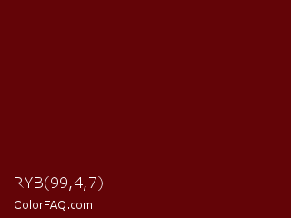 RYB 99,4,7 Color is a very dark red color and the nearest color is Rosewood #65000b. Hex code #630407 and RGB value is rgb(99,4,7). In RGB color space, this color is composed of 39% red, 2% green, 3% blue, In CMYK color space, this color is composed of 0% cyan, 96% magenta, 93% yellow , 61% black , In HSL color space, this color has a hue angle of 358° , 92% saturation and 20% lightness.