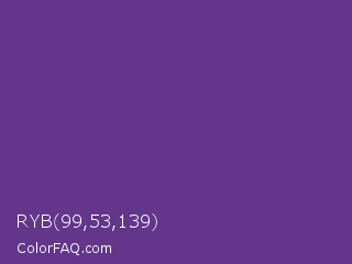 RYB 99,53,139 Color is a normal purple color and the nearest color is Eminence #6c3082. Hex code #63358b and RGB value is rgb(99,53,139). In RGB color space, this color is composed of 39% red, 21% green, 55% blue, In CMYK color space, this color is composed of 29% cyan, 62% magenta, 0% yellow , 45% black , In HSL color space, this color has a hue angle of 272° , 45% saturation and 38% lightness.
