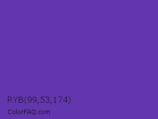 RYB 99,53,174 Color is a normal violet color and the nearest color is Grape #6f2da8. Hex code #6335ae and RGB value is rgb(99,53,174). In RGB color space, this color is composed of 39% red, 21% green, 68% blue, In CMYK color space, this color is composed of 43% cyan, 70% magenta, 0% yellow , 32% black , In HSL color space, this color has a hue angle of 263° , 53% saturation and 45% lightness.