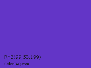 RYB 99,53,199 Color is a normal indigo color and the nearest color is Purple Heart Crayola #652dc1. Hex code #6335c7 and RGB value is rgb(99,53,199). In RGB color space, this color is composed of 39% red, 21% green, 78% blue, In CMYK color space, this color is composed of 50% cyan, 73% magenta, 0% yellow , 22% black , In HSL color space, this color has a hue angle of 259° , 58% saturation and 49% lightness.