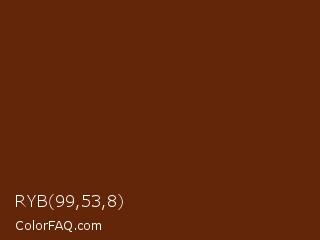 RYB 99,53,8 Color is a very dark orange color and the nearest color is Seal Brown #59260b. Hex code #632608 and RGB value is rgb(99,38,8). In RGB color space, this color is composed of 39% red, 15% green, 3% blue, In CMYK color space, this color is composed of 0% cyan, 62% magenta, 92% yellow , 61% black , In HSL color space, this color has a hue angle of 20° , 85% saturation and 21% lightness.