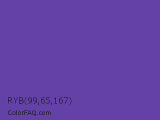 RYB 99,65,167 Color is a normal indigo color and the nearest color is Royal Purple #6b3fa0. Hex code #6341a7 and RGB value is rgb(99,65,167). In RGB color space, this color is composed of 39% red, 25% green, 65% blue, In CMYK color space, this color is composed of 41% cyan, 61% magenta, 0% yellow , 35% black , In HSL color space, this color has a hue angle of 260° , 44% saturation and 45% lightness.