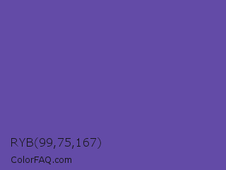 RYB 99,75,167 Color is a normal indigo color and the nearest color is Butterfly Bush #624e9a. Hex code #634ba7 and RGB value is rgb(99,75,167). In RGB color space, this color is composed of 39% red, 29% green, 65% blue, In CMYK color space, this color is composed of 41% cyan, 55% magenta, 0% yellow , 35% black , In HSL color space, this color has a hue angle of 256° , 38% saturation and 47% lightness.