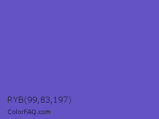 RYB 99,83,197 Color is a normal indigo color and the nearest color is Slate Blue #6a5acd. Hex code #6353c5 and RGB value is rgb(99,83,197). In RGB color space, this color is composed of 39% red, 33% green, 77% blue, In CMYK color space, this color is composed of 50% cyan, 58% magenta, 0% yellow , 23% black , In HSL color space, this color has a hue angle of 248° , 50% saturation and 55% lightness.