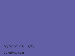 RYB 99,95,167 Color is a normal indigo color and the nearest color is Scampi #675fa6. Hex code #635fa7 and RGB value is rgb(99,95,167). In RGB color space, this color is composed of 39% red, 37% green, 65% blue, In CMYK color space, this color is composed of 41% cyan, 43% magenta, 0% yellow , 35% black , In HSL color space, this color has a hue angle of 243° , 29% saturation and 51% lightness.