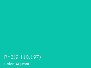 RYB 9,110,197 Color is a normal cyan color and the nearest color is Amazonite #00c4b0. Hex code #09c5ab and RGB value is rgb(9,197,171). In RGB color space, this color is composed of 4% red, 77% green, 67% blue, In CMYK color space, this color is composed of 95% cyan, 0% magenta, 13% yellow , 23% black , In HSL color space, this color has a hue angle of 172° , 91% saturation and 40% lightness.
