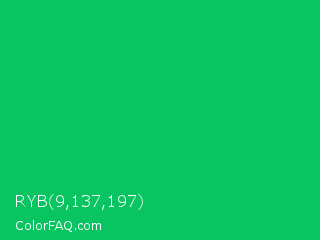 RYB 9,137,197 Color is a normal green color and the nearest color is Malachite #0bda51. Hex code #09c561 and RGB value is rgb(9,197,97). In RGB color space, this color is composed of 4% red, 77% green, 38% blue, In CMYK color space, this color is composed of 95% cyan, 0% magenta, 51% yellow , 23% black , In HSL color space, this color has a hue angle of 148° , 91% saturation and 40% lightness.