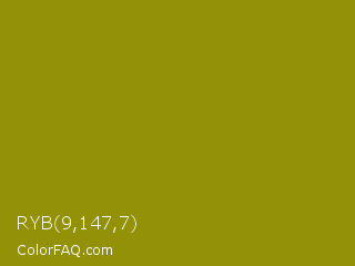 RYB 9,147,7 Color is a dark yellow color and the nearest color is Dark Yellow #9b870c. Hex code #939107 and RGB value is rgb(147,145,7). In RGB color space, this color is composed of 58% red, 57% green, 3% blue, In CMYK color space, this color is composed of 0% cyan, 1% magenta, 95% yellow , 42% black , In HSL color space, this color has a hue angle of 59° , 91% saturation and 30% lightness.